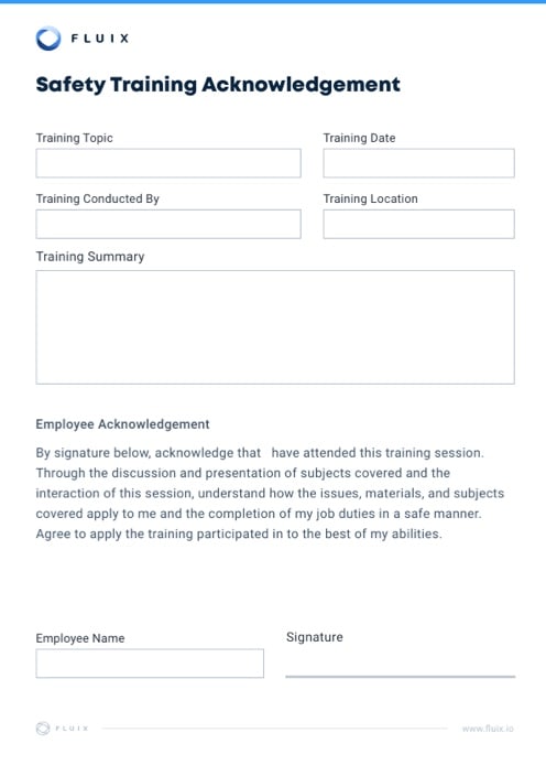 Fluix is a safety management software that is ideal for creating, capturing and managing your safety training acknowledgement forms. As a safety management solution, Fluix makes it easy to keep track of all your forms, both complete and in-progress. Your team can quickly check that employees have filled out all necessary forms. Plus, they can use tablets and other mobile devices to get signatures after a training session is completed. Check out Fluix today to see how it can make organizing your safety documents easier.